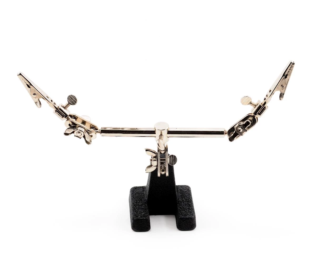 Has two spring-loaded alligator clips mounted on ball joints to hold parts at any angle, leaving hands free to work on your project. Features include wing nuts on a ball joints for ease of positioning and weighted base to give stability.