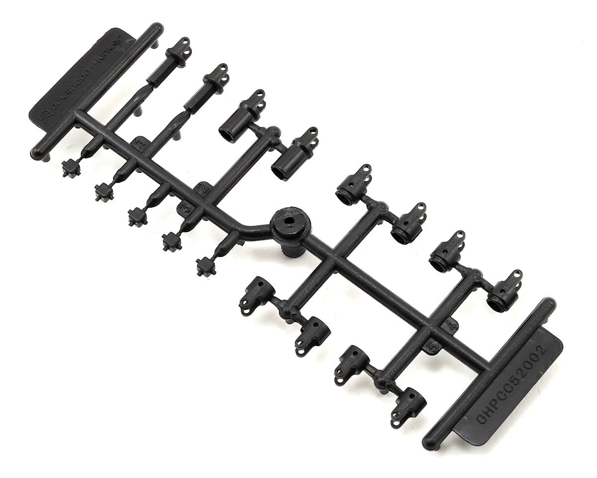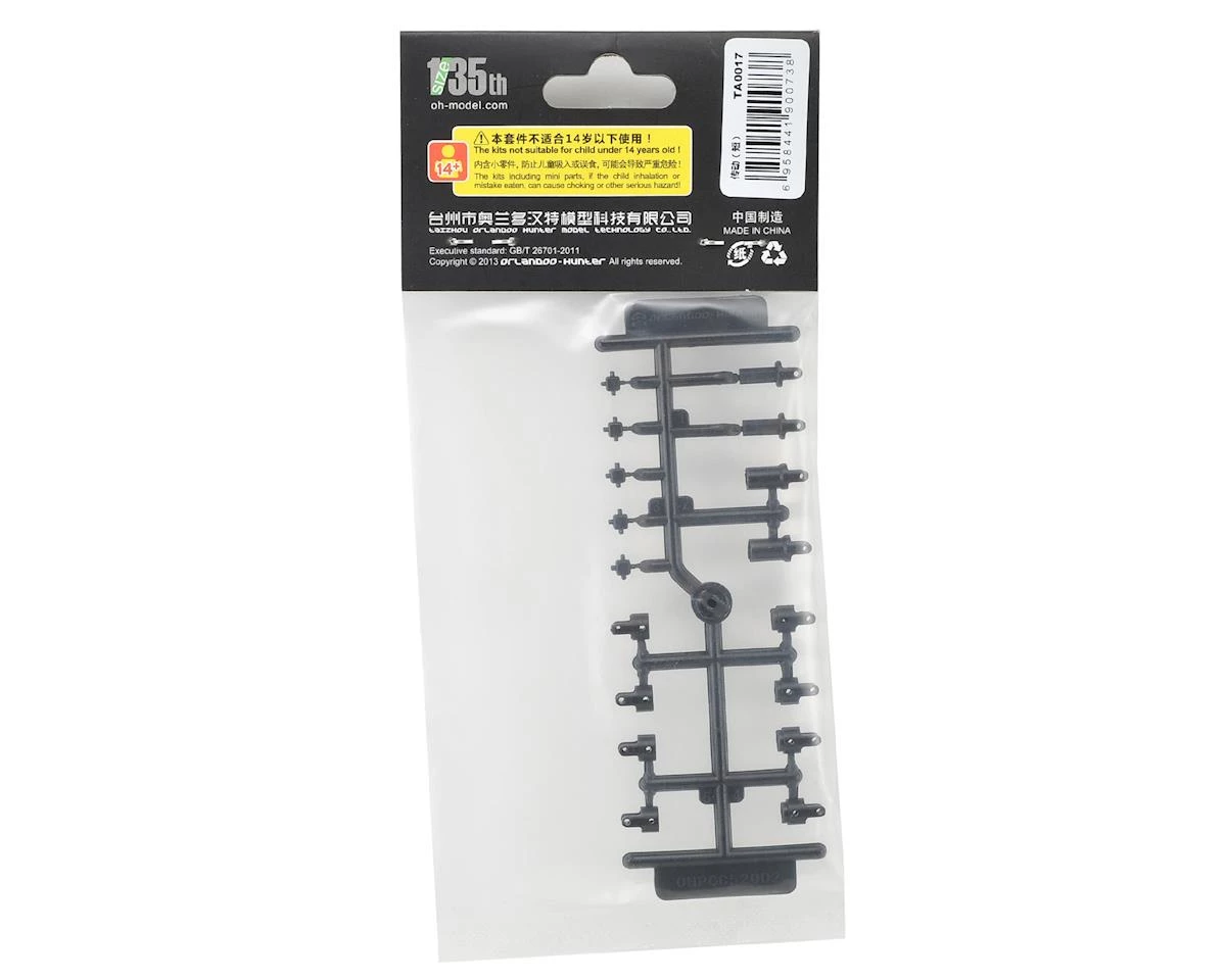 Orlandoo Hunter 35A01 Center Driveshaft Set. Package includes replacement male and female driveshaft halves, yokes and plastic x coupler needed to build two Orlandoo 35A01 Jeep driveshafts.