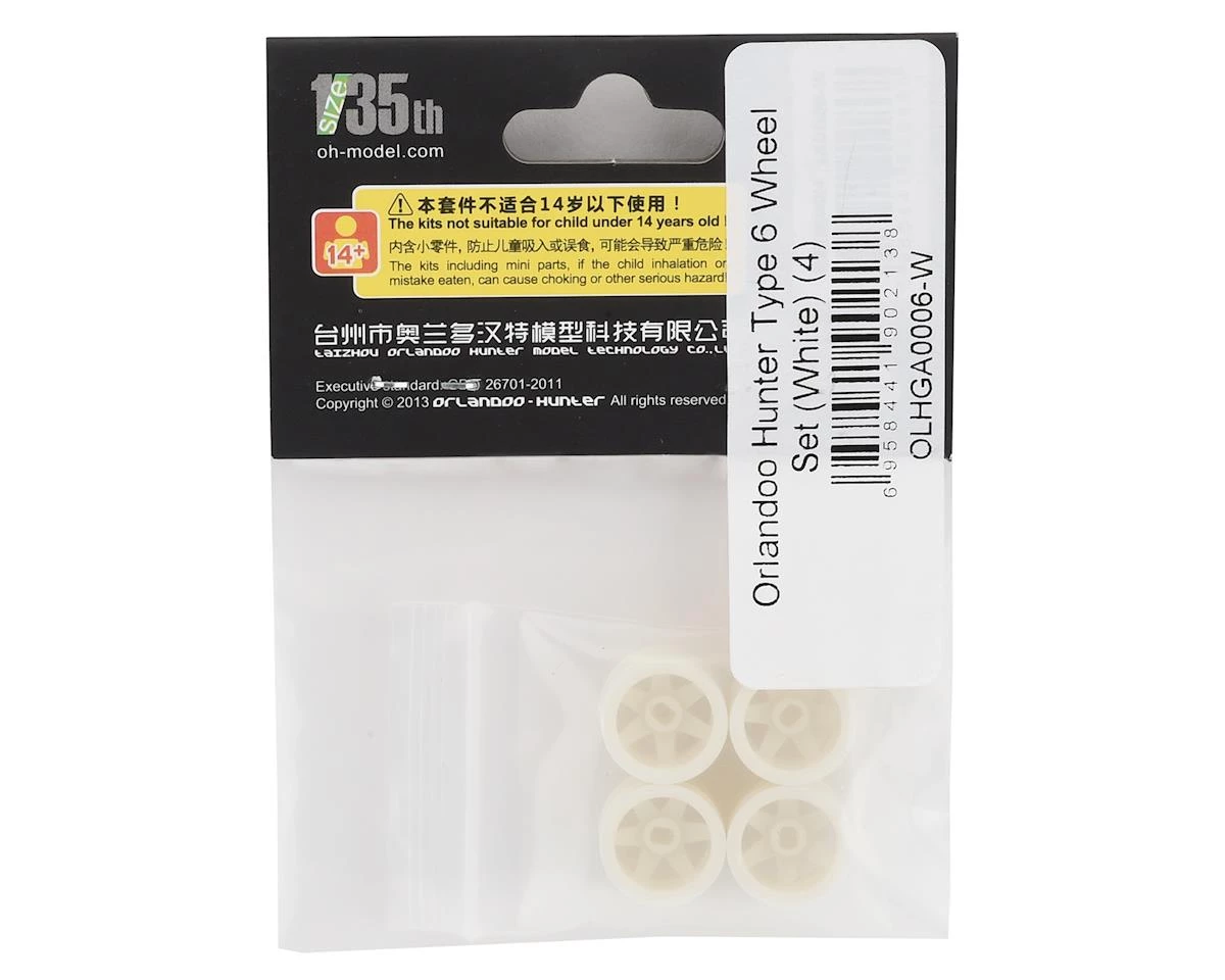 Orlandoo Hunter Type 6 Wheel Set. These optional wheels features a six spoke design, and give you a custom wheel choice that fits the size and scale of your Orlandoo 35A01 Jeep or 35P01 F150 kit perfectly. Package includes 4 wheels.